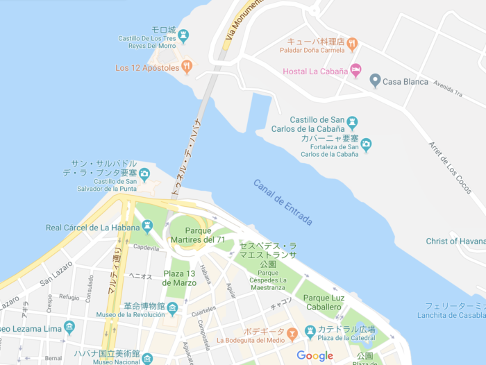ハバナは河口にある街で、チェ・ゲバラのお家は河の向こうにある。こちら側の川岸に立てば、すぐ対岸に見えてる。向こう岸とは橋ではなくて、海中トンネルでつながっていて、ちょっとがんばれば歩いていけそうな感じ。
